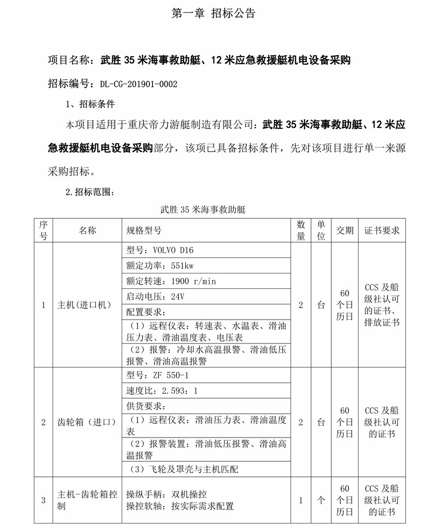 武勝35米海事應急救援艇機電設備采購